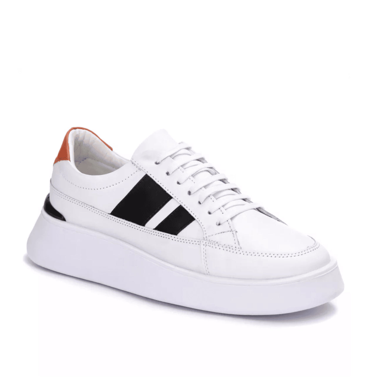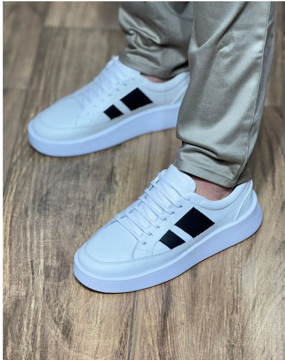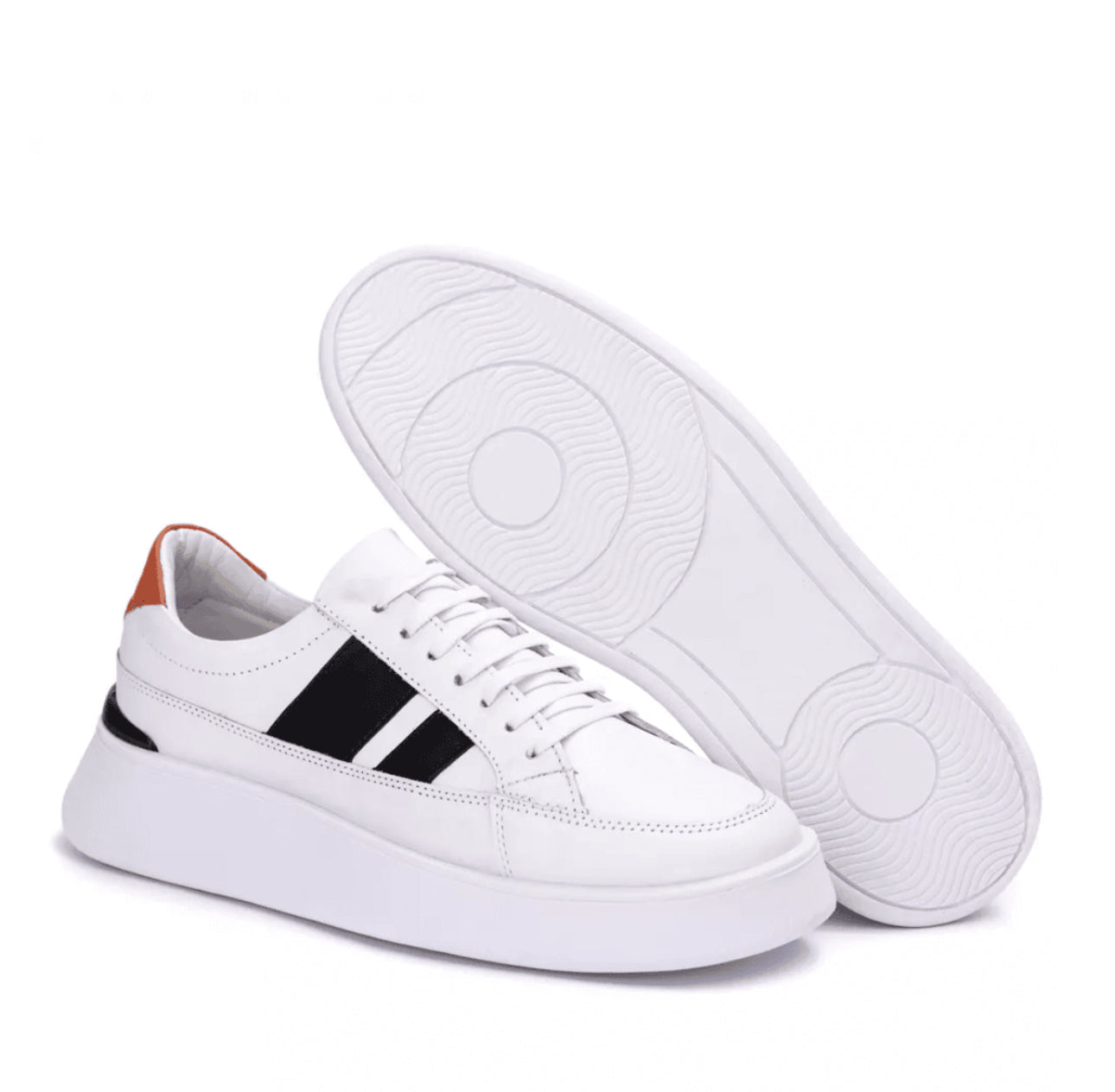 Esse calçado em couro legítimo branco com listra preta lateral é a definição de elegância casual com atitude. A sola mais alta garante presença, conforto e um toque moderno que transforma qualquer look.