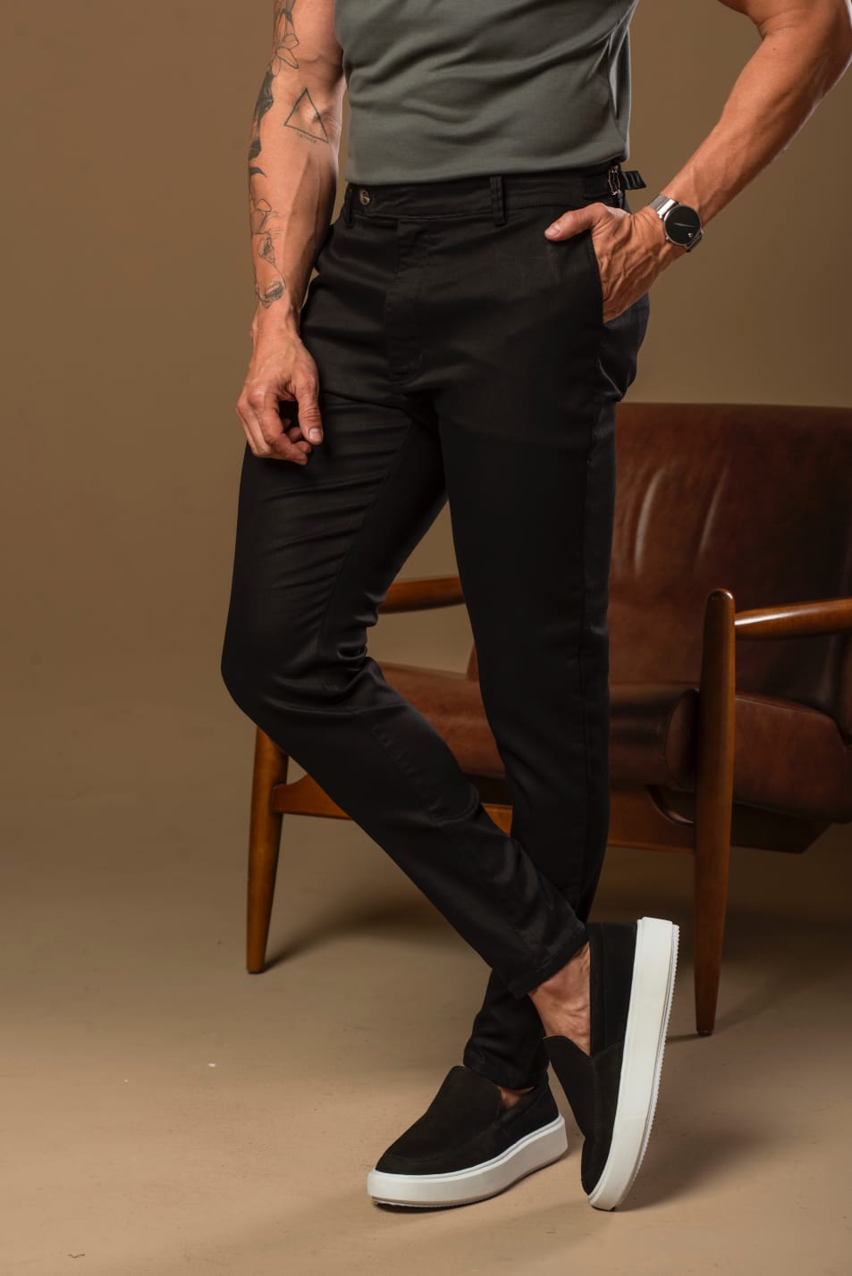 Com caimento ajustado e tecido encorpado, ela valoriza a silhueta masculina e permite composições que vão do casual sofisticado ao look mais alinhado — seja com camisa, camiseta ou até um blazer leve.