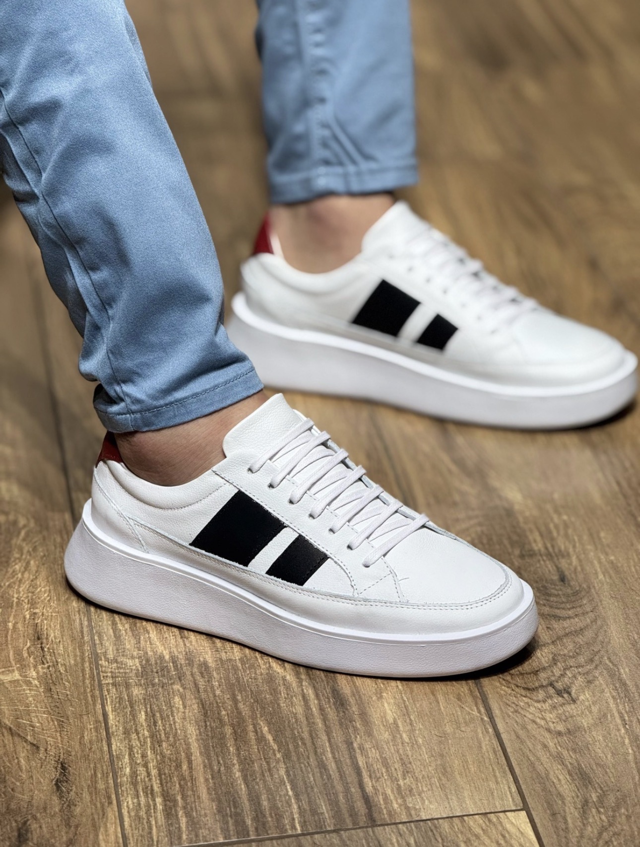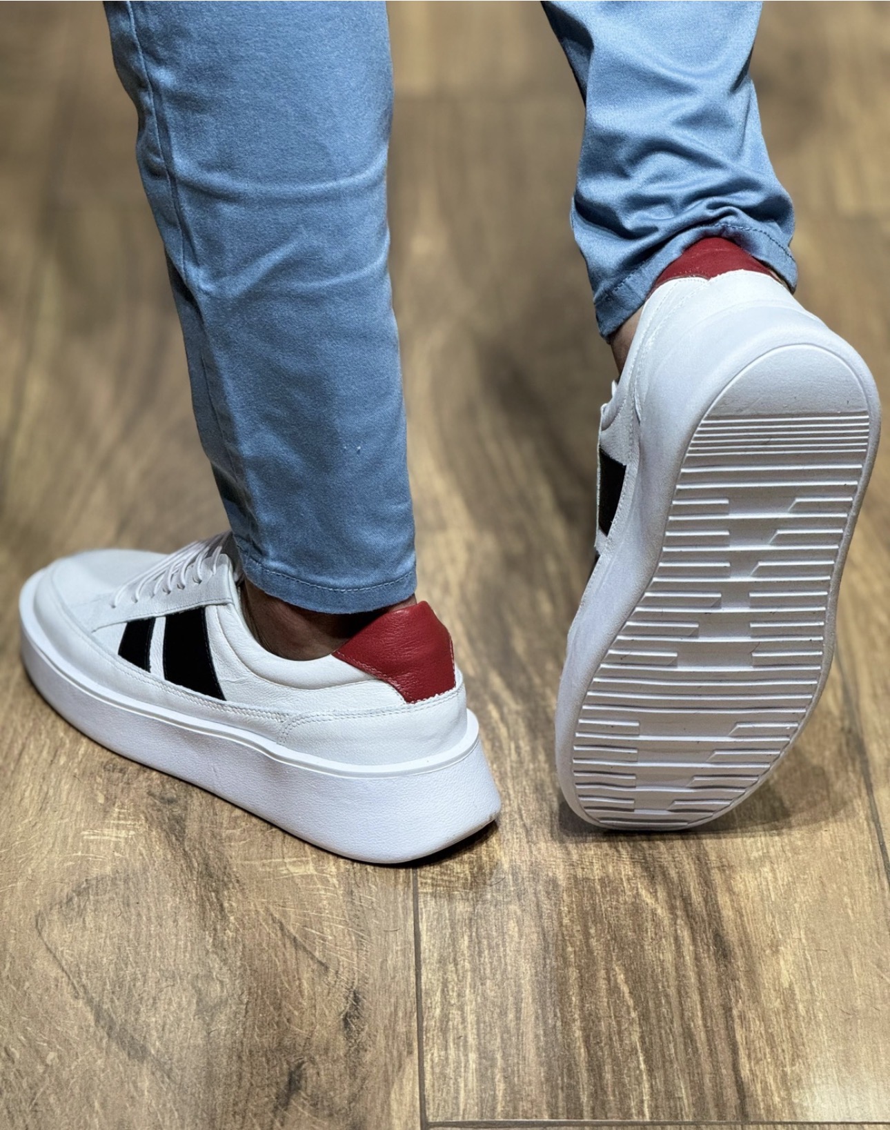 • Contraste Premium: Acabamento em branco clássico com detalhes em preto e um toque de cor no calcanhar.